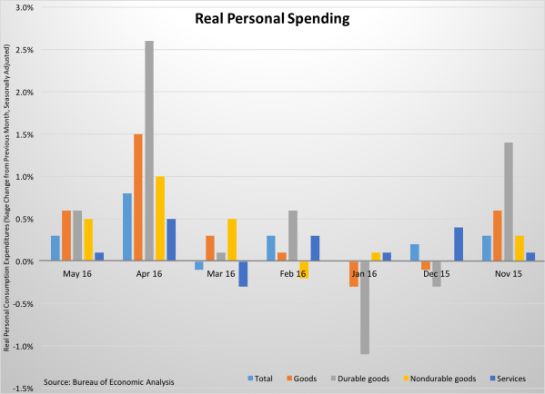 May was the worst month for job creation since the summer of 2010. Meanwhile, consumers were spending their increased disposable income.